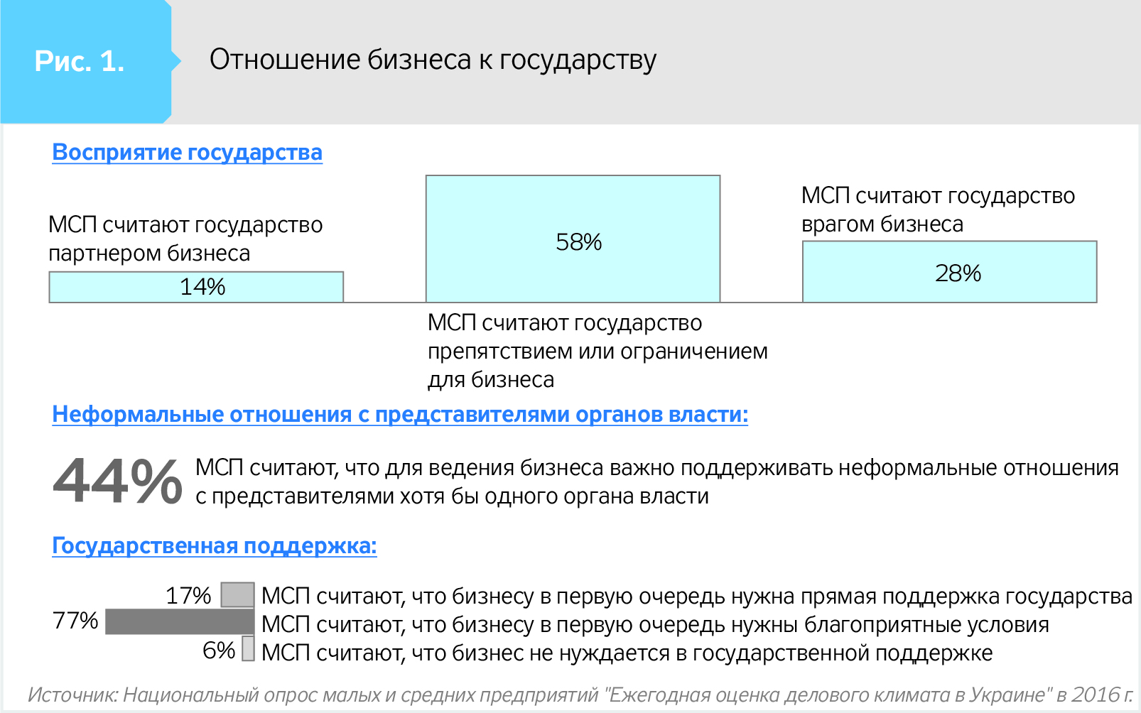 "Не виявляє малий і середній бізнес і лояльності до держави - 58% його представників вважають державу перешкодою та обмеженням, 28 - ворогом і тільки 14% вбачають у ній партнера", – йдеться в статті.