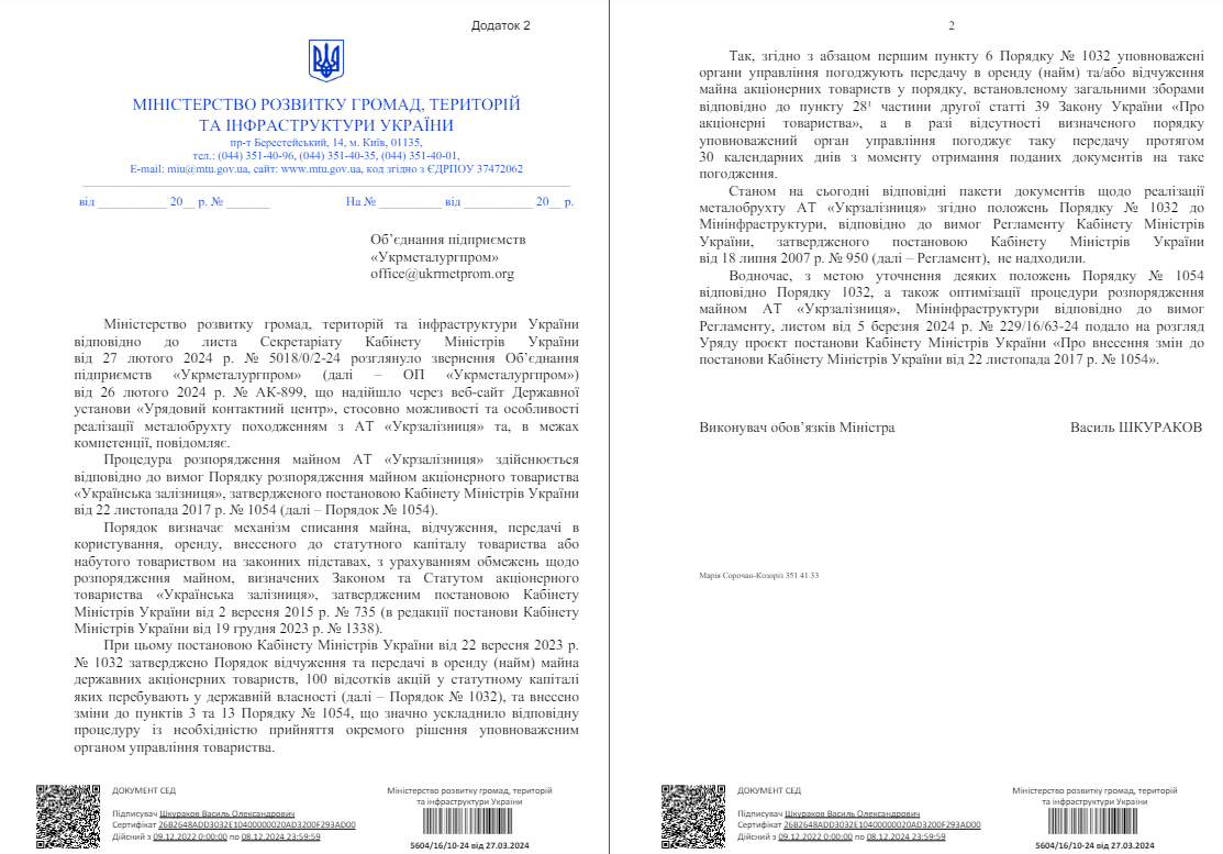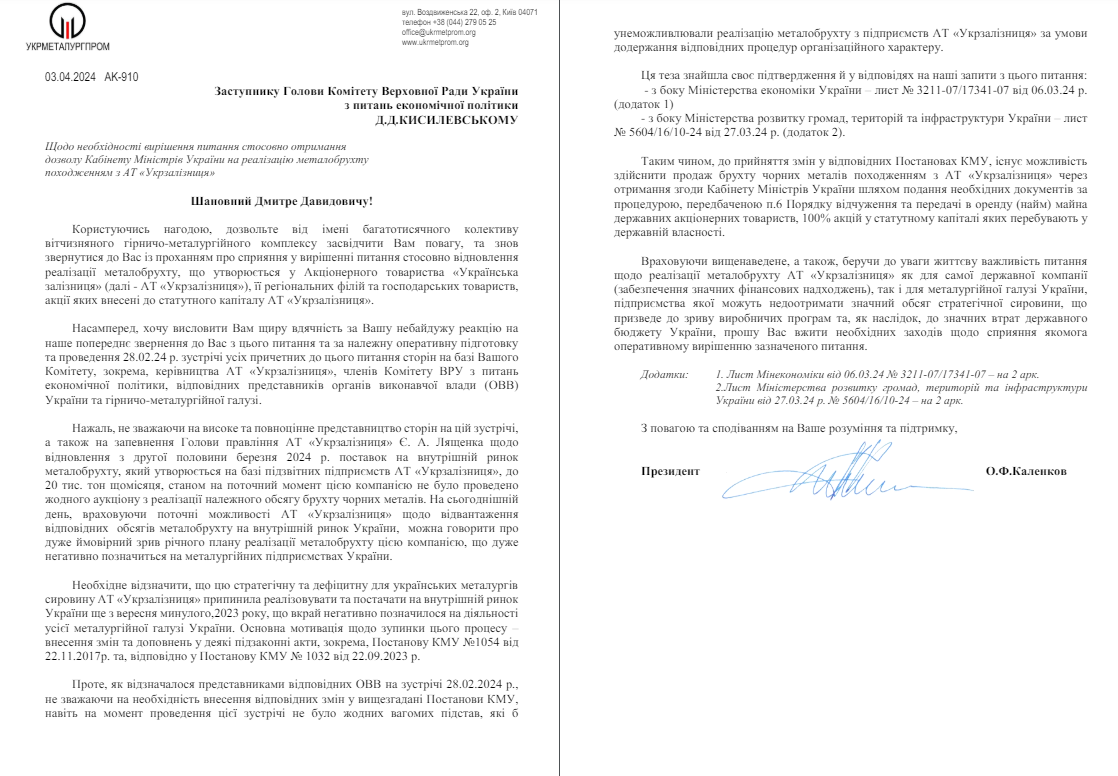 «Враховуючи вищенаведене, а також, беручи до уваги життєву важливість питання щодо реалізації металобрухту АТ «Укрзалізниця» як для самої державної компанії (забезпечення значних фінансових надходжень), так і для металургійної галузі України, підприємства якої можуть недоотримати значний обсяг стратегічної сировини, що призведе до зриву виробничих програм та, як наслідок, до значних втрат державного бюджету України, прошу вжити необхідних заходів щодо сприяння якомога оперативному вирішенню зазначеного питання», — констатується у листі.