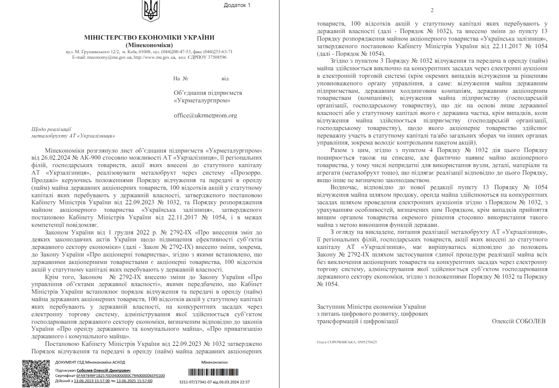 «Основна мотивація щодо зупинки цього процесу – внесення змін та доповнень у деякі підзаконні акти. Проте, як відзначалося представниками відповідних органів виконавчої влади на зустрічі 28.02.2024 р., навіть на момент проведення тієї зустрічі не було жодних вагомих підстав, які б унеможливлювали реалізацію металобрухту з підприємств АТ «Укрзалізниця» за умови додержання відповідних процедур організаційного характеру», — підкреслюється у документі.