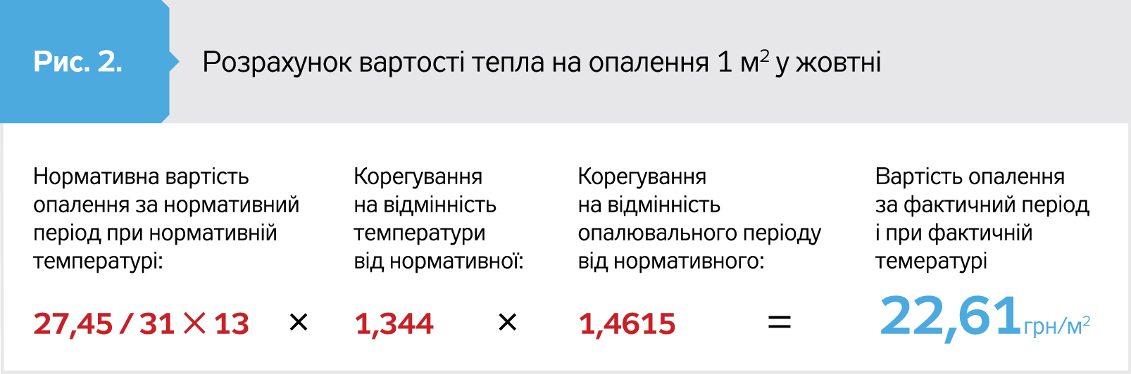"З урахуванням цих параметрів можемо з погляду здорового глузду обчислити вартість тепла на опалення 1 кв. м у жовтні. Таким чином, для чернівчан вартість опалення мала би дорівнювати 22,61 грн/кв. м:(27,45/31*13)*1,344*1,4615 = 22,61 грн/кв. м, де: 27,45 - вартість опалення 1 кв. м при повному місяці опалення і нормативній температурі; 31 - днів у жовтні; 13 -опалювальних днів у жовтні за нормативом; відповідно (27,45/31*13) - нормативна вартість опалення в жовтні; 1,344 - коефіцієнт, що враховує зниження нормативної температури (разів); 1,4615 -коефіцієнт, що враховує збільшення опалювального періоду (разів)", – наводить свої розрахунки Дейнега.