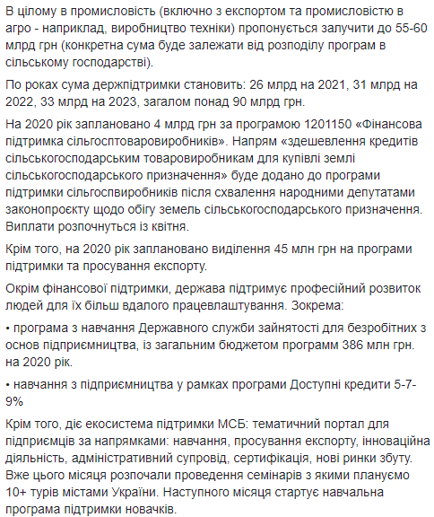 Міністр економіки Тимофій Милованов вирішив виділити 90 мільярдів гривень на підтримку агросектору та промисловості, про що повідомив на своїй сторінці в Facebook. Однак його ініціативу той же час розкритикувала глава Мінфіну Оксана Маркарова, назвавши ініціативу Милованова помилкою.