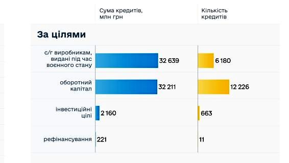 6 754 кредитів на суму 34,4 млрд грн отримала аграрна галузь. Майже на половину менше – оптова та роздрібна торгівля, ремонт транспортних засобів. Це 7,1 тисяча кредитів на 15,7 млрд грн. Майже на такому рівні переробна промисловість – 2 494 кредитів на 11,5 млрд грн.