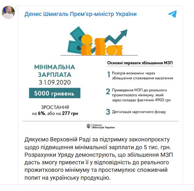 Як зазначив прем'єр-міністр Денис Шмигаль в своєму Telegram-каналі, розрахунки уряду показують, що збільшення мінімальної зарплати дозволить привести її у відповідність з реальним прожитковим мінімумом, який зараз становить 4900 гривень і простимулює споживчий попит на українську продукцію.