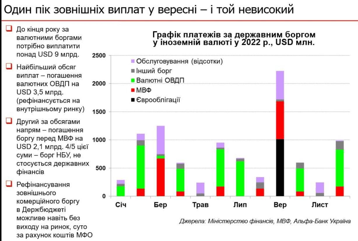 Відповідно до даних Мінфіну, до кінця року Україна має виплатити $9 млрд за зовнішніми зобов'язаннями. Пік припаде на вересень.