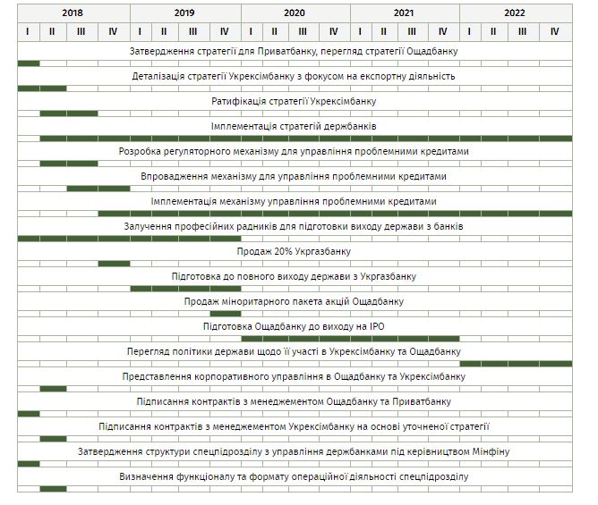 Також держава планує продати 20% акцій не менше трьох держбанків приватному інвестору і скоротити частку проблемних кредитів у їх кредитному портфелі до менш 10% з 2019 р.
