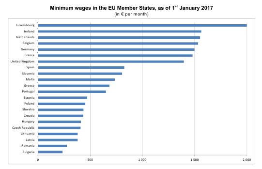 Як повідомляє Eurostat, в десяти східноєвропейських країнах мінімальна заробітна плата була нижче 500 євро в місяць: Болгарія (235), Румунія (275), Латвія і Литва (380), Чехія (407), Угорщина (412), Хорватія (433), Словаччина (435), Польща (453) і Естонія (470).