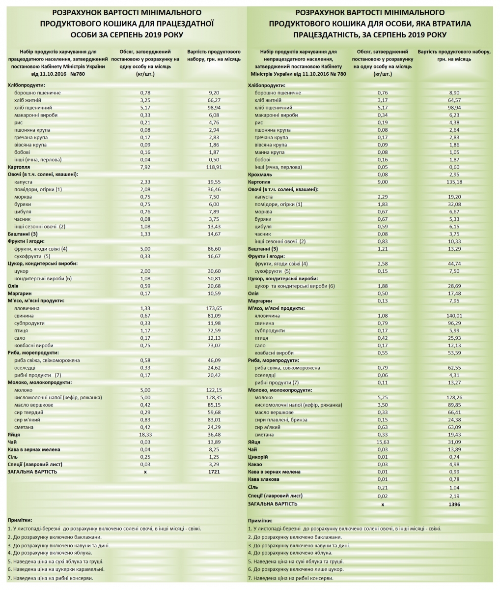 У серпні 2019 року розрахункова середньомісячна вартість мінімального продуктового кошика (МПК) становила: для працездатної особи – 1 721 грн (86% від рівня прожиткового мінімуму для цієї категорії населення); для особи, яка втратила працездатність – 1 396 грн (89% від рівня прожиткового мінімуму для цієї категорії населення). Такі данні оприлюднив Економічний дискусійний клуб на своєму сайті.