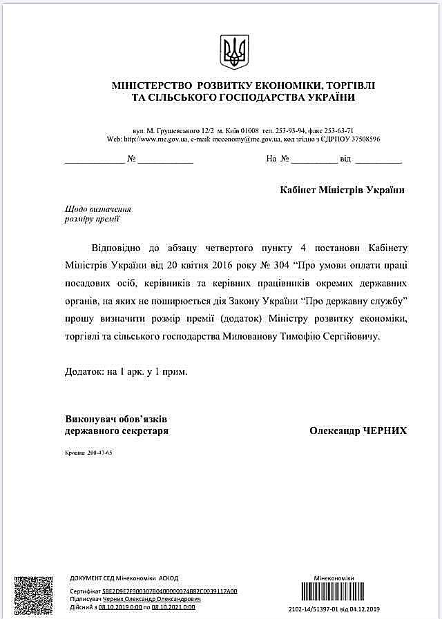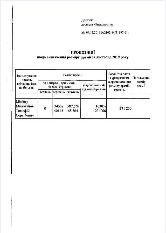 Міністру економічного розвитку, торгівлі і сільського господарства України Тимофія Мілованову, при розрахунку премії за листопад поточного року, було запропоновано нарахувати премію в розмірі 1630% або 236 тисяч гривень. Таким чином, його заробітна плата за листопад місяць, з урахуванням запропонованих премій, може скласти 271 тисячу гривень. Про це йдеться у документі, який є у розпорядженні DT.UA.