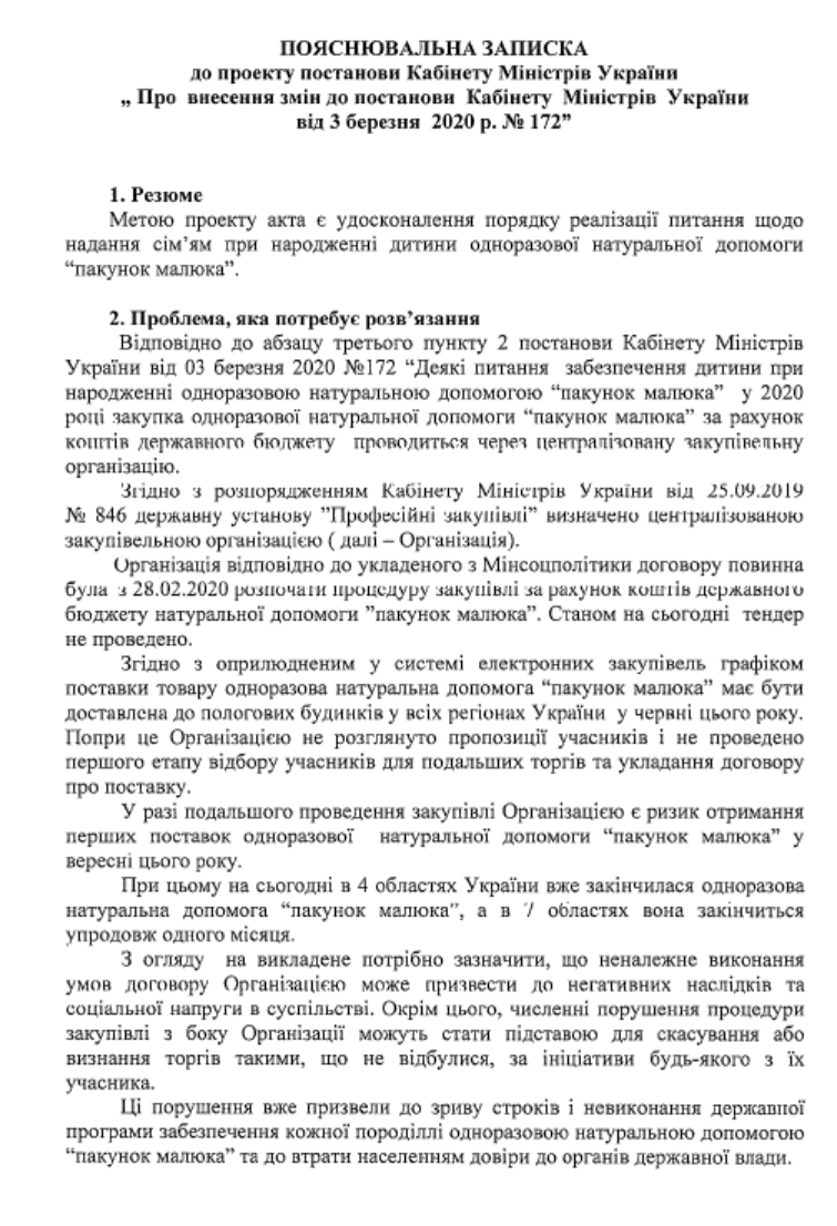 У пояснювальній записці до документа йдеться про те, що "Професійні закупівлі" відповідно до договору з міністерством мали почати процедуру закупівлі з 28 лютого. Однак станом на 29 травня тендер не провели.