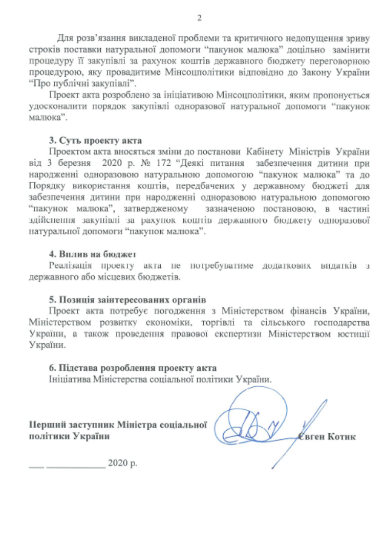 Наразі ДП "Професійні закупівлі" МЕРТ саме проводить для Міністерства соціальної політики тендер для придбання "пакунків малюка" загальною вартістю на 1,23 млрд грн. У свою чергу перший заступник міністра соцполітики Євген Котик 29 травня подав до Кабінету міністрів проект постанови, у якій йдеться про те, що відомство хоче самостійно провести неконкурентну процедуру закупівлі бебі-боксів.