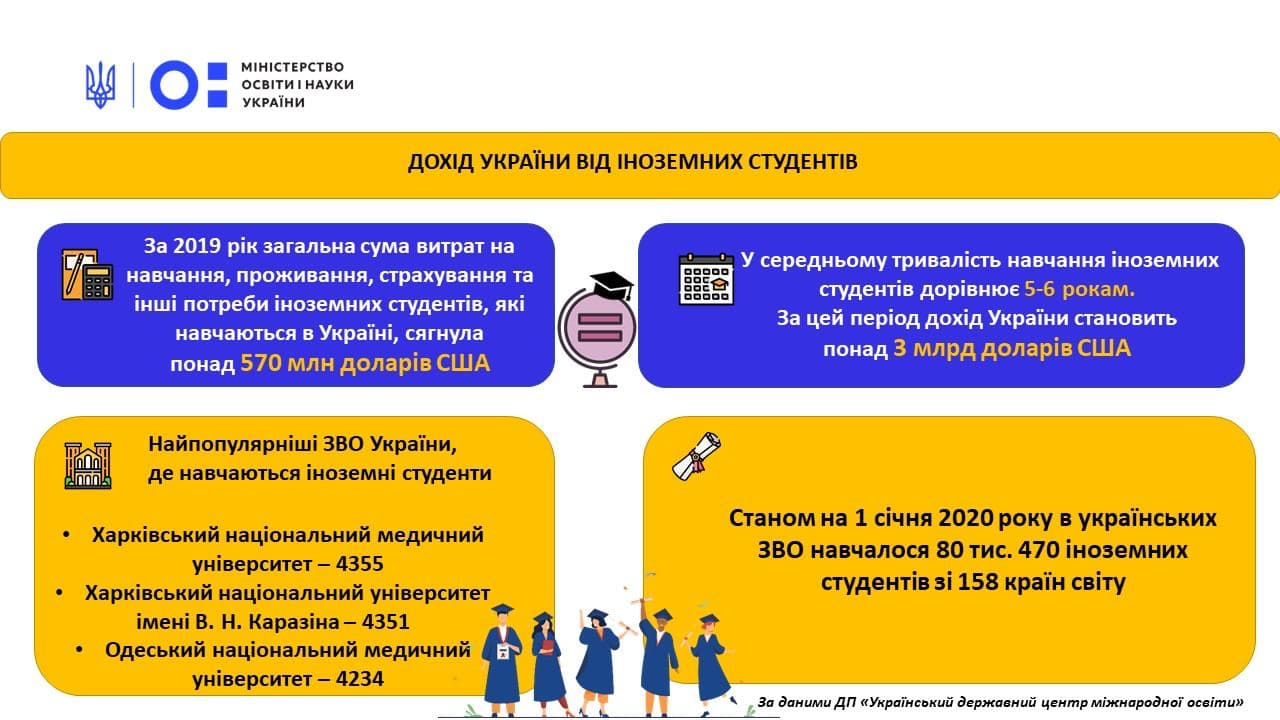 У 2019 році на проживання, страхування, харчування, оформлення документів та все інше іноземці витратили в Україні понад 570 млн доларів. Зважаючи на те, що середня тривалість навчання 5-6 років, то загалом дохід держави від студентів з-за кордону за цей період становить понад 3 млрд доларів.