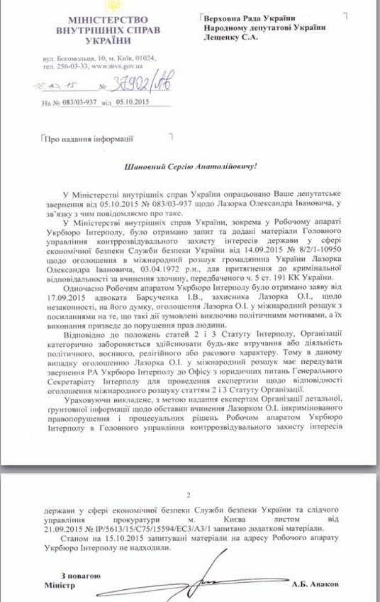 "Відповідно до положень статей 2 і 3 Статуту Інтерполу, Організації категорично забороняється здійснювати будь-яке втручання у діяльність політичного, військового, релігійного або расового характеру. Тому в даному випадку оголошення Лазорка у міжнародний розшук повинно передувати звернення Робочого апарату Укрбюро Інтерполу в Офіс з юридичних питань генерального Секретаріату Інтерполу для проведення експертизи щодо відповідності оголошення міжнародного розшуку статтями 2 і 3 Статуту Інтерполу", - йдеться у відповіді на запит.