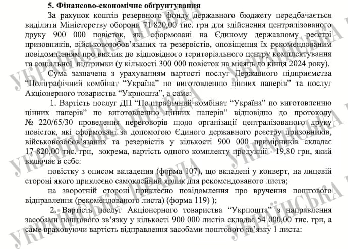 Уряд виділив 71 млн 820 тисяч гривень на централізований друк та розсилку повісток, передає «Українська правда» з посиланням на документи, які отримала в розпорядження. За ці гроші до кінця року мають надрукувати та розіслати 900 тисяч повісток.