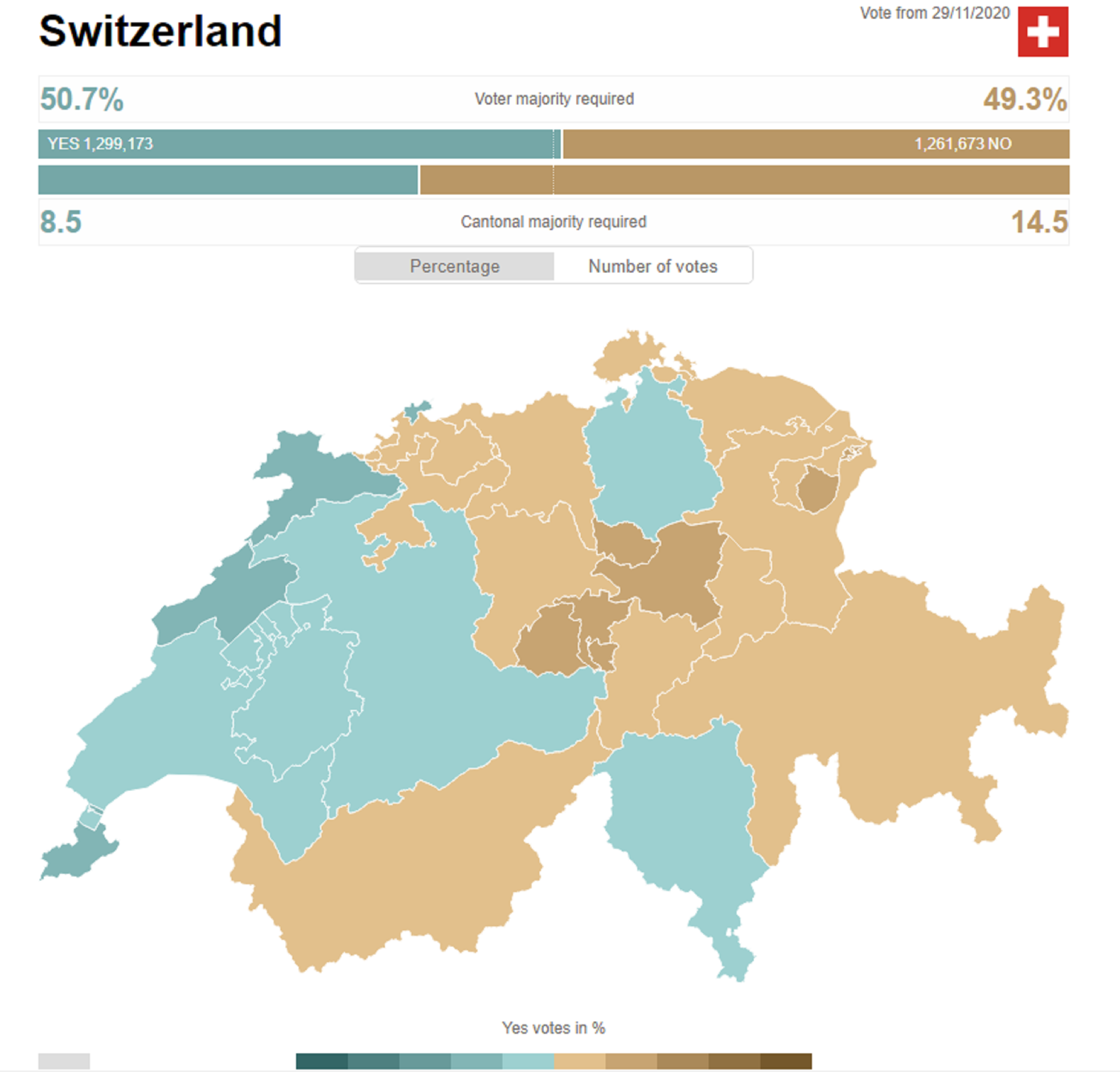 За даними Swiss Info, більшість з 26 швейцарських кантонів відхилили ініціативу, втім, їй вдалося набрати 50,7% голосів виборців.