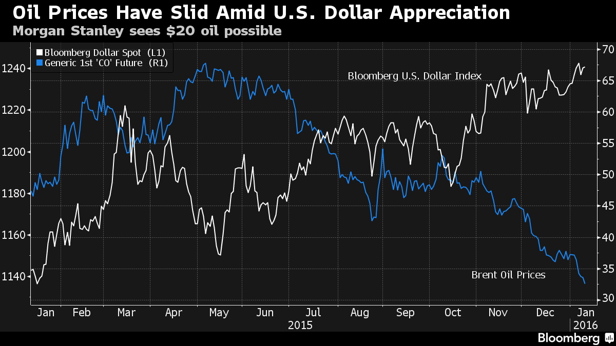 У Morgan Stanley вважають, що різке зміцнення курсу долара США може призвести до падіння цін на нафту до 20 доларів за барель, пише агентство Bloomberg.