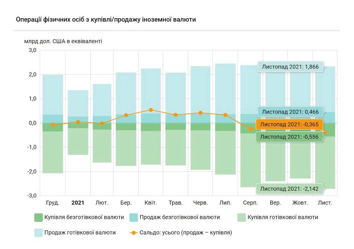 З початку року, тобто за 11 місяців, населення продало на 1,35 млрд дол більше валюти, ніж купило.