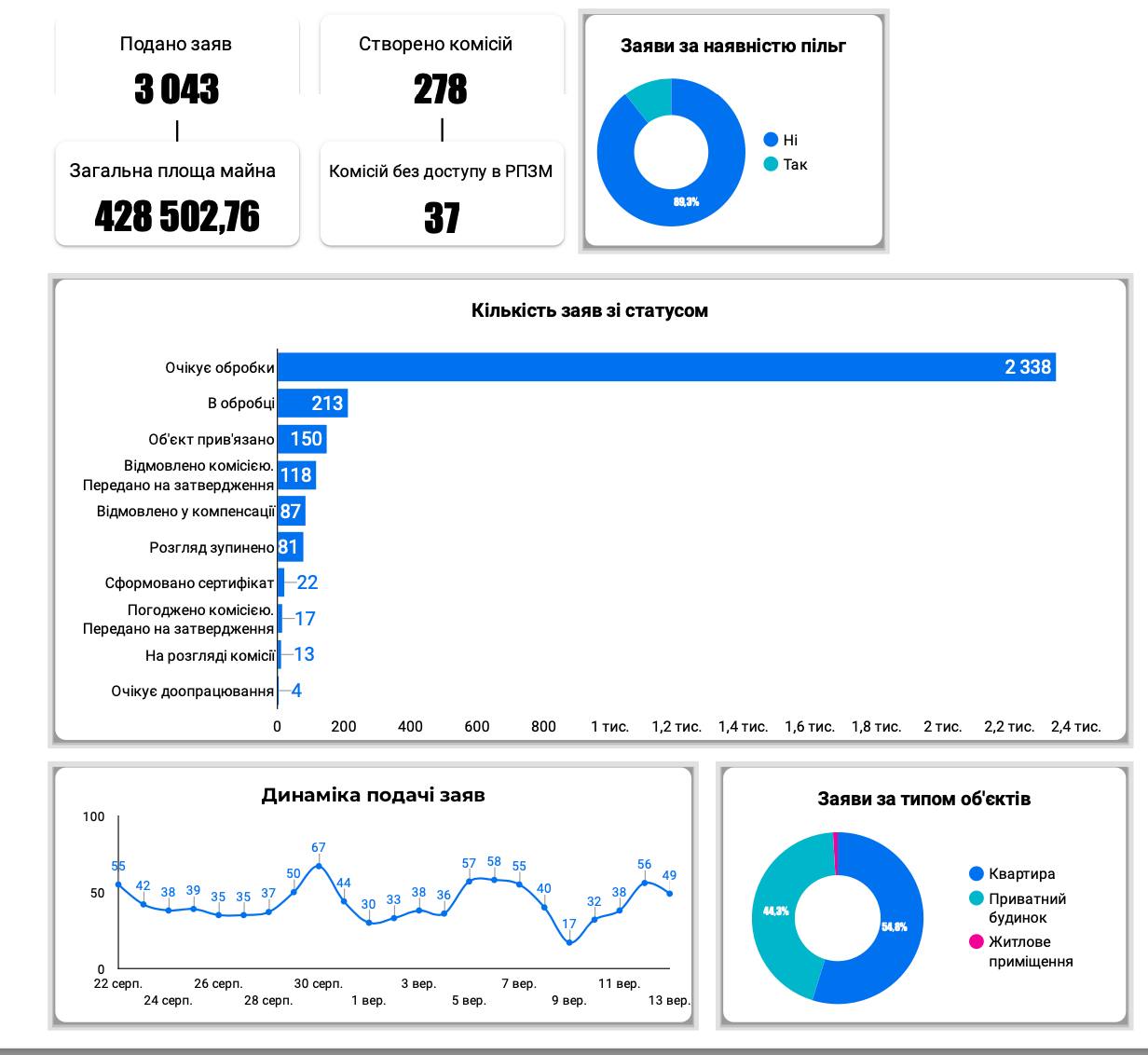 Найбільше заяв на компенсацію за знищене майно подають власники квартир – 54,8% від загальної кількості заявок – і трохи менше власники приватних будинків – 44,3%.