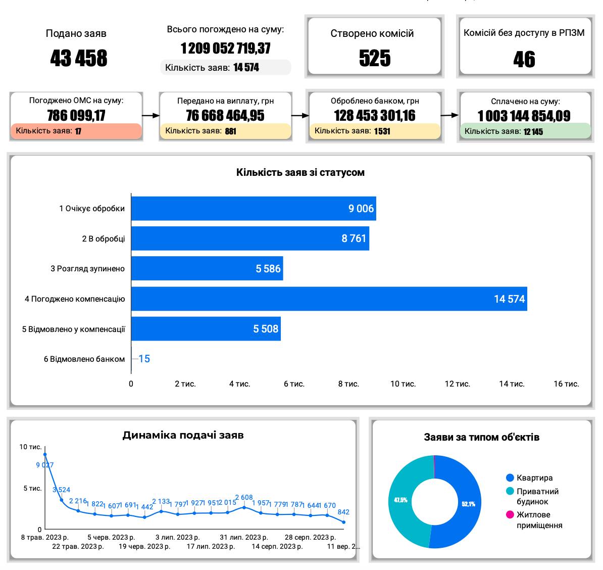 На компенсацію за пошкоджене житло також претендує більше власників квартир, ніж приватних будинків – 52,1% і 46,5% заяв відповідно.