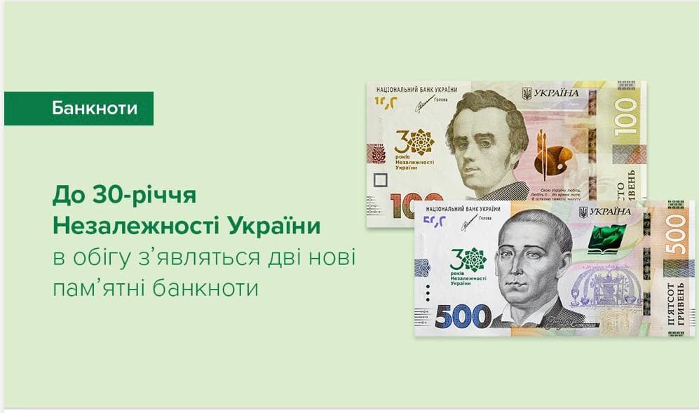 Нацбанк анансіровал введення в обіг 20 серпня двох пам'ятних банкнот номіналами 100 і 500 грн. Обидві присвячені 30-річчю Незалежності України. Про це повідомляє прес-служба регулятора.