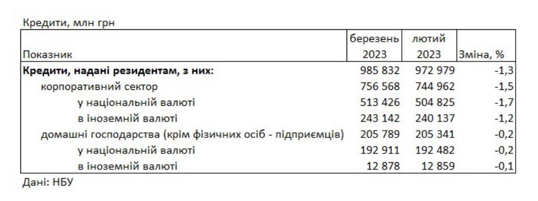 Кредитний портфель банків за березень скоротився на 1,3% до 973 млрд грн, у т.ч. населенню скоротилося на 0,2% до 205 млрд грн, підприємствам скоротилося на 1,5% до 755 млрд грн.