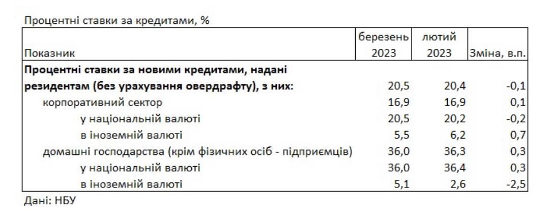 Середні відсоткові ставки за новими банківськими кредитами для населення у національній валюті в березні становили 36,4% річних. Порівняно з лютим ставки зросли на 0,4 п.п. Про це йдеться у оперативних даних Нацбанку (НБУ).