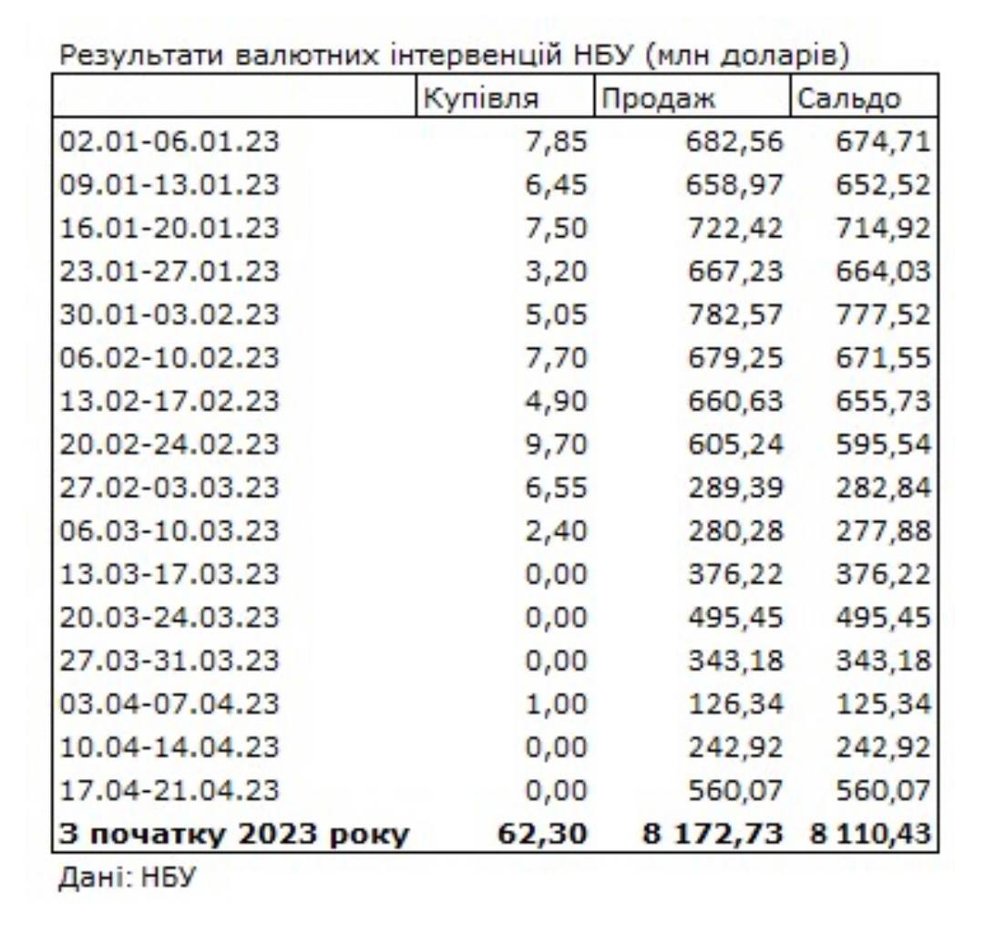 Національний банк України (НБУ) тижня, що закінчується - з 17 по 21 квітня - продав на міжбанківському валютному ринку 560,07 млн доларів.