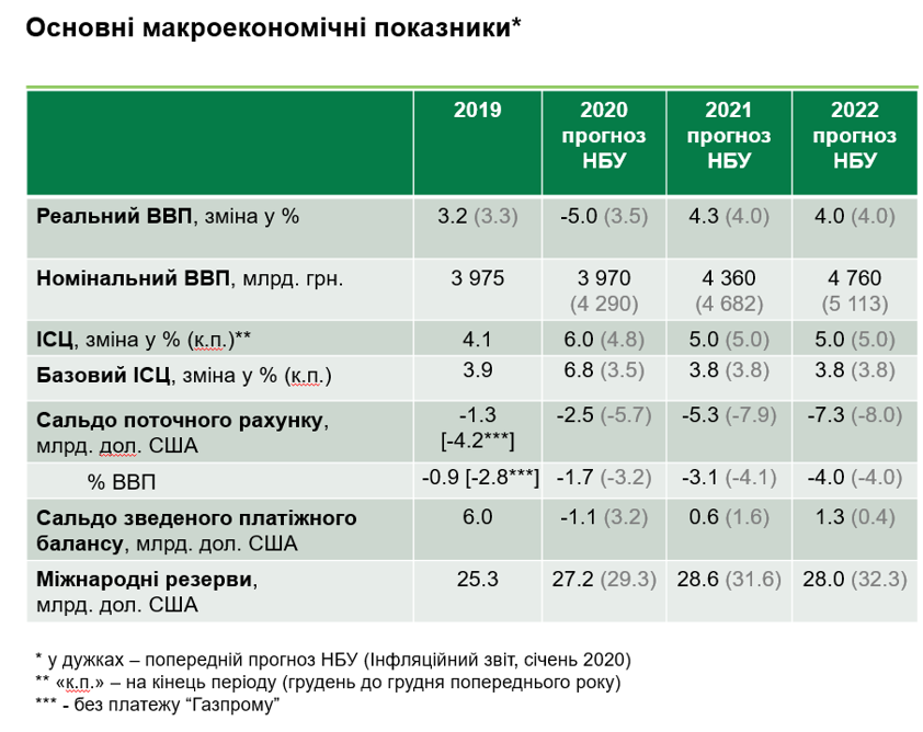 Обвал економіки 2020 року (падіння на 5%) буде забезпечений в основному поганими результатами другого кварталу, відзначають у Нацбанку. Вже в другій половині року економіка почне відновлюватися: в 2021-22 роках темпи зростання ВВП перевищить 4%, говориться в оновленому макропрогнозі регулятора.