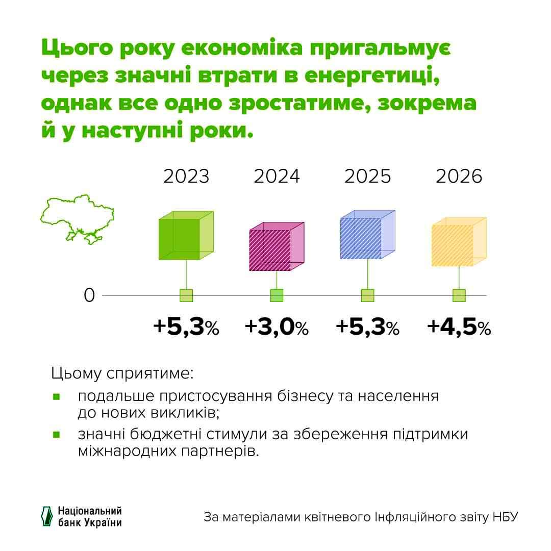 “Цьому сприятимуть як подальше пристосування бізнесу та населення до нових викликів, так і значні бюджетні стимули за збереження підтримки міжнародних партнерів” – вважає НБУ.