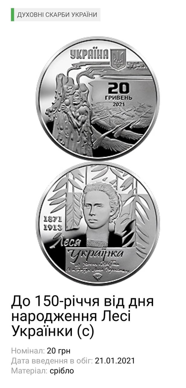 Срібна монета номіналом 20 грн присвячена українській поетесі, драматургу, перекладачці, літературному критику і громадській діячці - Лесі Українці (Ларисі Петрівні Косач).