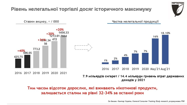 Стрімке зростання акцизів на тютюнову продукцію призвело до аналогічної тенденції на нелегального ринку. Через це бюджет України у 2021 році недоотримає, за оцінками фахівців, близько 14 млрд гривень. За п'ять років з 2017 року нелегальний тютюновий ринок зрісіз 2,3% до 18,1%.