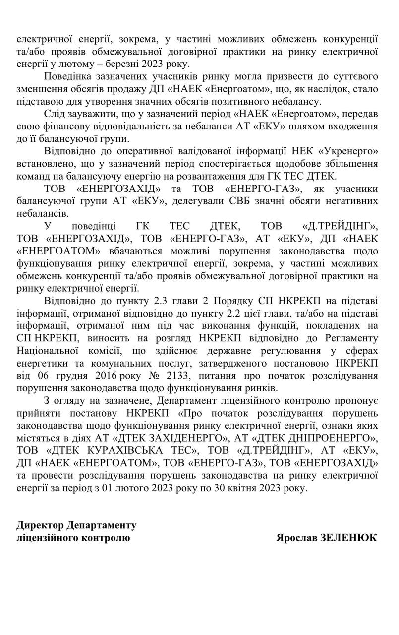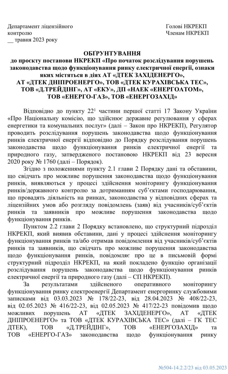 Нацкомісія, що здійснює держрегулювання у сферах енергетики і комунальних послуг (НКРЕКП), почала розслідування можливих незаконних дій групи учасників енергоринку з метою одержання економічних вигод компаніями енергохолдингу "ДТЕК" за рахунок фінансових втрат держпідприємства "НАЕК "Енергоатом". Про це йдеться в документі, який є в розпорядженні ZN.UA.