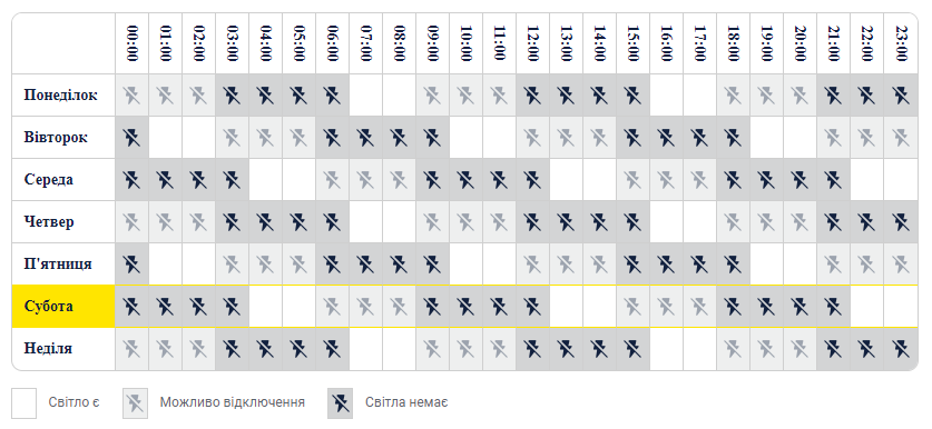 - світло-сірий позначає періоди, у які електроенергія може відключатися в разі збільшення дисбалансу в енергетичній системі. У такі години компанія просить людей зменшувати своє споживання електрики й не користуватися ліфтами.