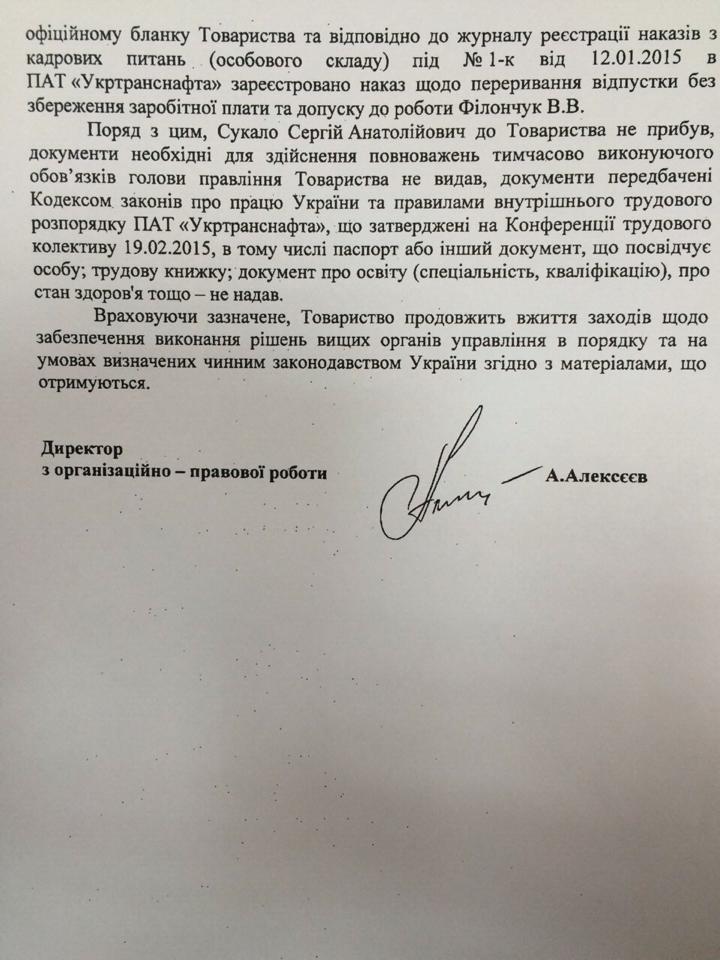 У листі менеджер "Укртранснафти" стверджує, що Сукало не прибув в центральний офіс компанії і не надав необхідних документів для здійснення своїх повноважень, повідомляє Лігабізнесінформ з посиланням на документ.