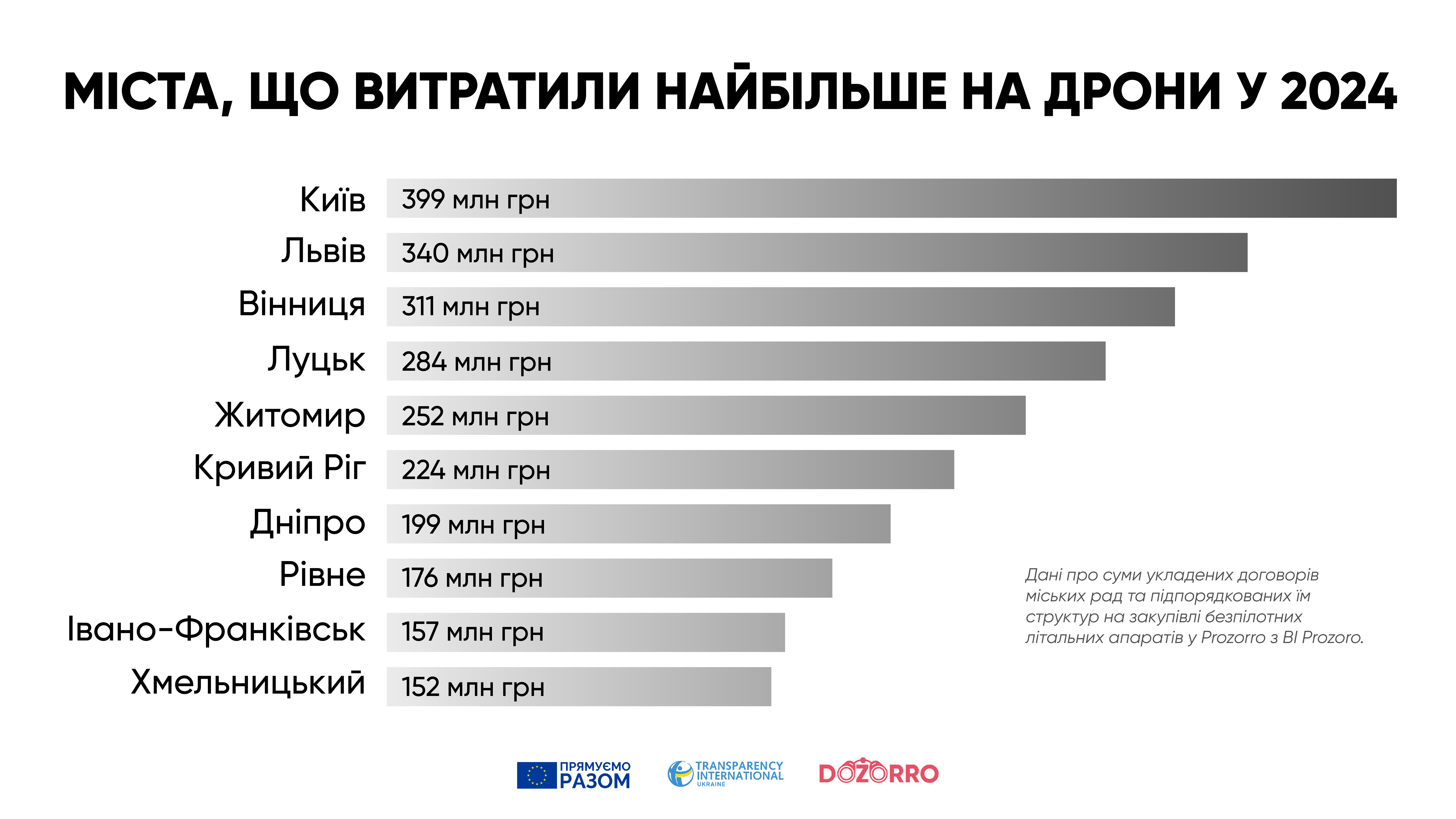 Київська міська рада — 399 млн грн. У столиці майже вся сума припадає на одну закупівлю Департаменту муніципальної безпеки КМДА, який у липні уклав договір на постачання 2,5 тис. DJI Мavic на загальну суму 391,5 млн грн. Тоді департамент законтрактував 1 550 DJI Мavic 3T та 950 DJI Мavic 3Е.