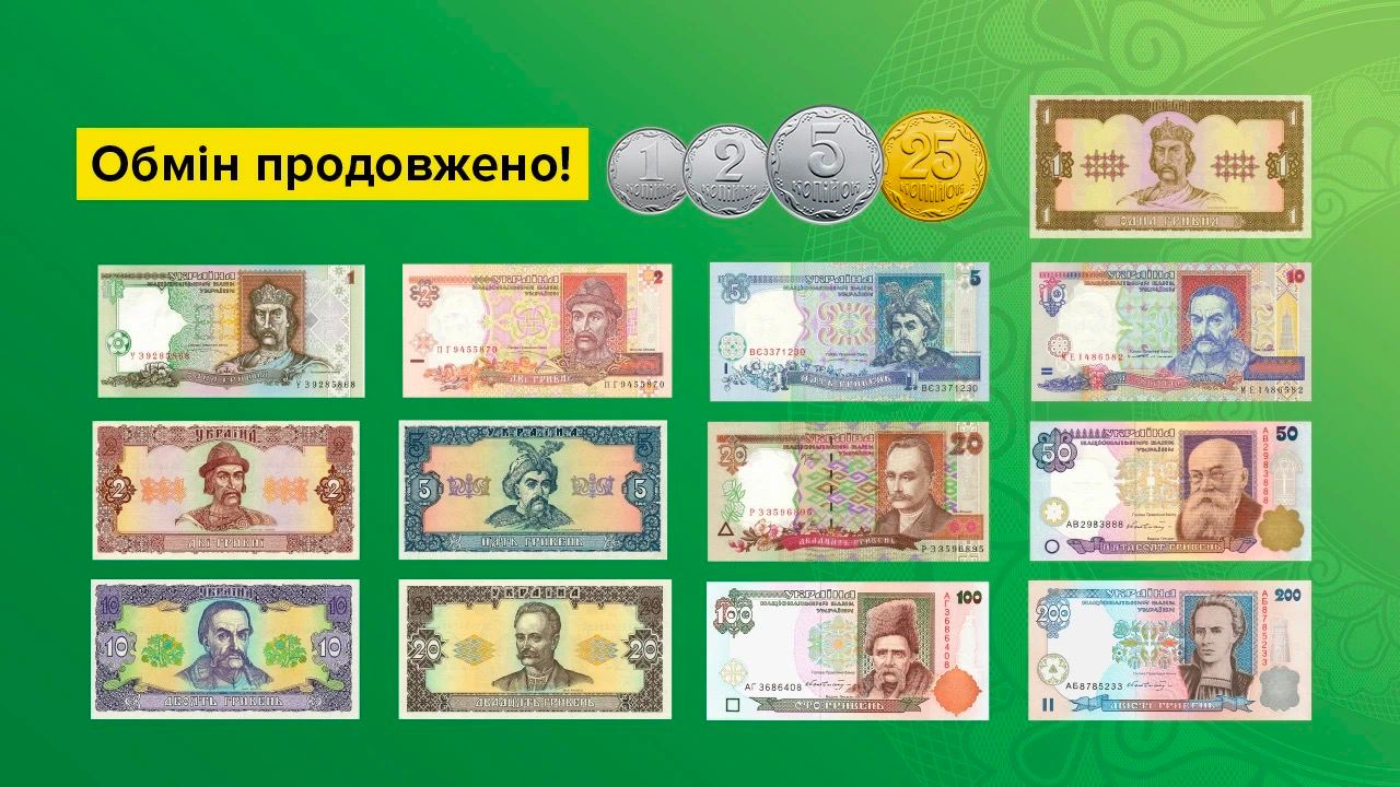 Монети номіналами 1, 2, 5 та 25 копійок та банкноти номіналами 1, 2, 5, 10, 20, 50, 100 та 200 гривень зразків до 2003 року всіх років випуску можна буде обмінювати до кінця дії воєнного стану в Україні та ще впродовж трьох місяців (90 календарних днів) після його припинення або скасування.