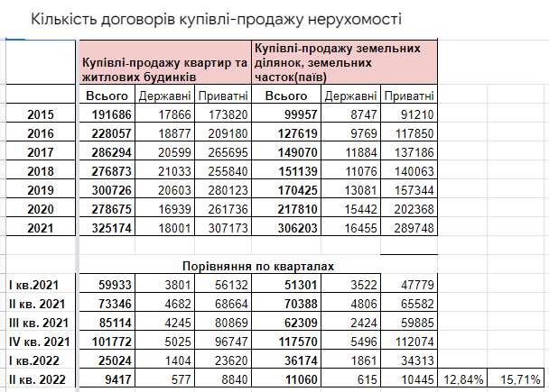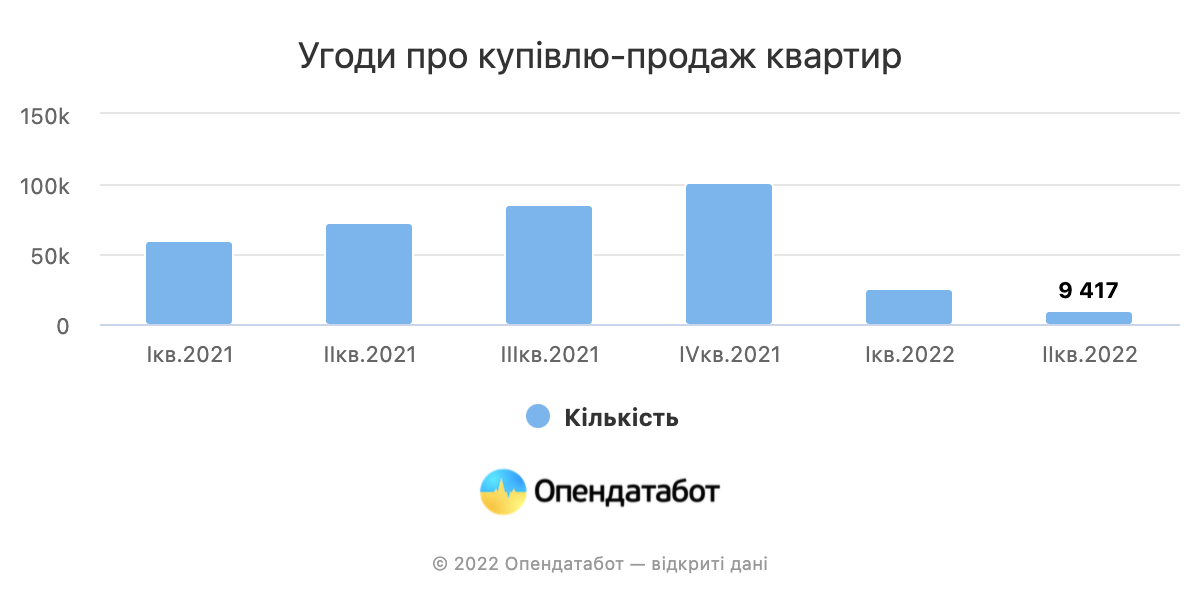 У другому кварталі 2022 року нотаріуси оформили угоди купівлі-продажу 20 477 об'єктів нерухомості. Це у 8 разів менше, ніж до війни. А у порівнянні з минулорічними показниками становить лише 13%.