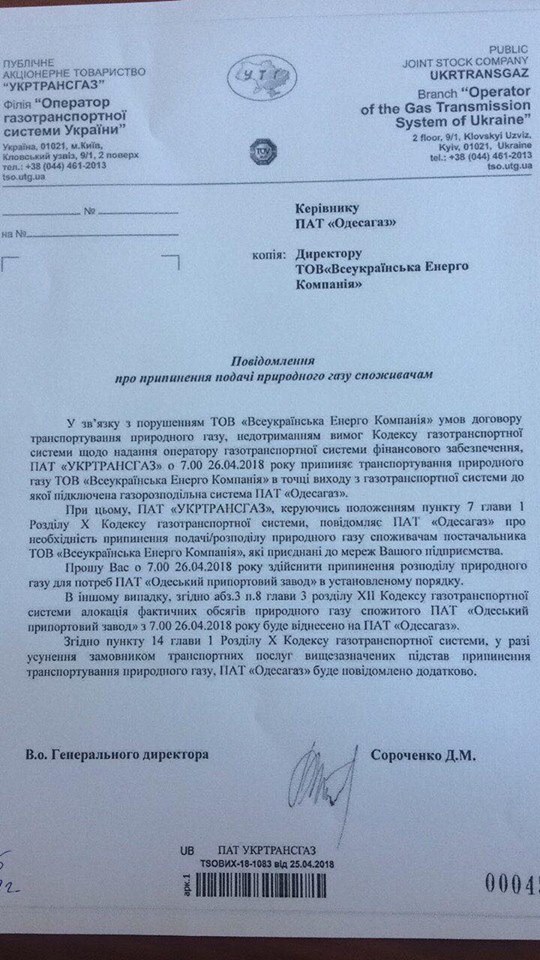 Згідно з повідомленням "Укртрансгазу", транспортування природного газу ТОВ "Всеукраїнська енерго компанія" в точці виходу з газотранспортної системи, до якої підключена газорозподільна система ПАТ "Одесагаз", припиняється о 7:00 26 квітня.