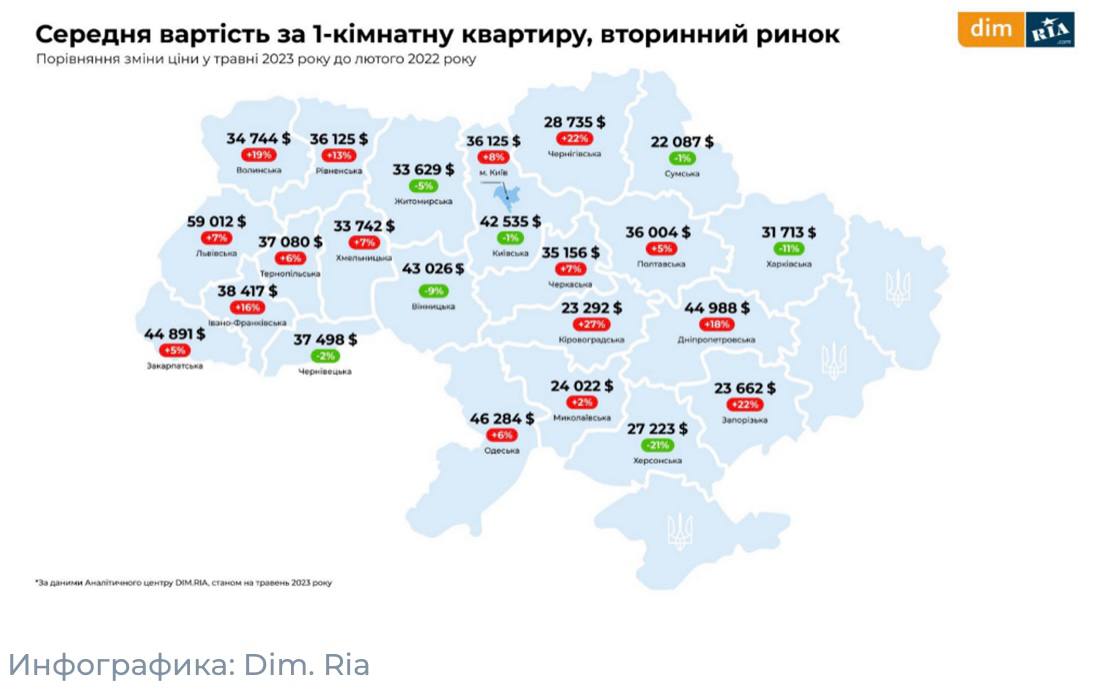 У Львівській області середня ціна однокімнатної квартири в районі 59 012 доларів США, що на 3% більше квітня і на 7% більше лютого 2022 року.