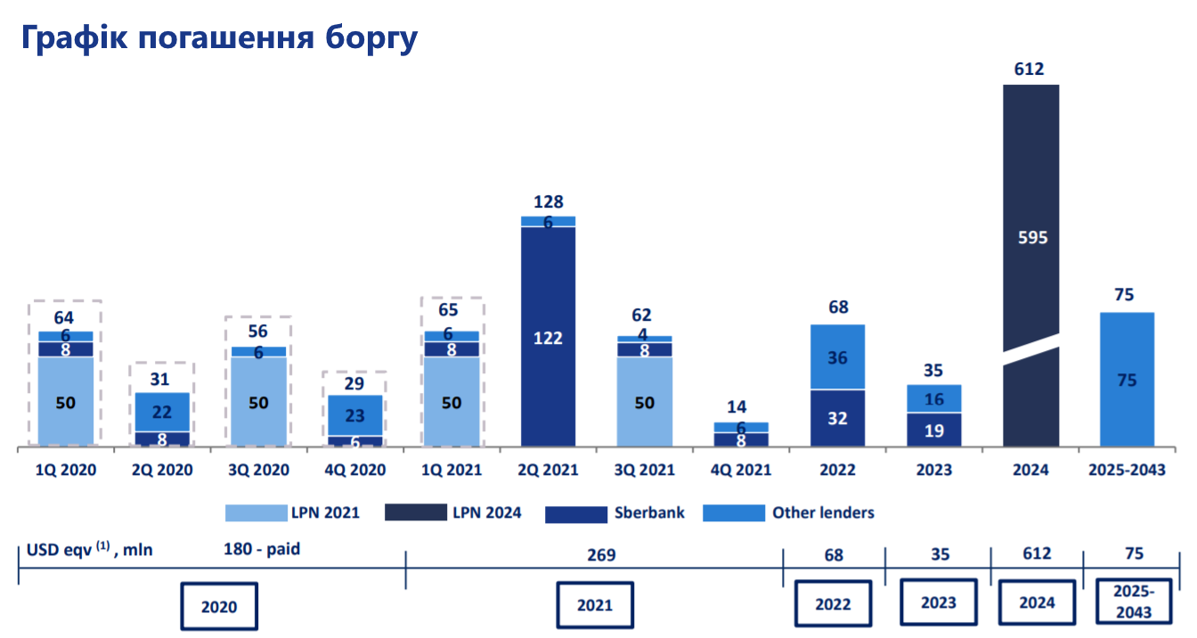 На графіку боргових виплат видно, як зростатимуть зобов’язання компанії у наступні роки, пік припадає на 2024-й — більш як 612 млн дол., або майже 17 млрд грн. Нагадаємо, 2020-й компанія завершила зі збитками у 11,8 млрд грн.