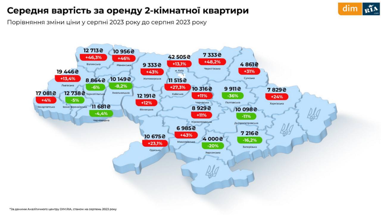 Станом на кінець серпня 2023 року ціна оренди однокімнатної квартири у столиці складає 20 438 грн. Порівняно з липнем ціна зросла на 18%, а з минулого року – на 42%.
