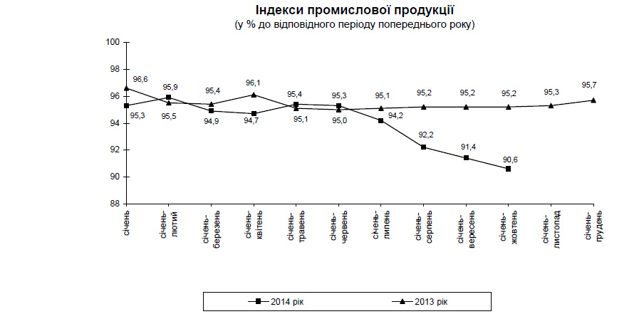 За десять місяців з початку 2014 року падіння виробництва становить 9,4% (за підсумками дев'яти місяців падіння було 8,6%, восьми - 7,8%, семи - 5,8%).
