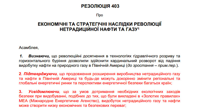 У резолюції, текст якої має у своєму розпорядженні ZN.UA (український переклад підготовлено Центром глобалістики "Стратегія XXI") акцентується увага на стратегічних наслідках сланцевої революції у Північній Америці і адресується відкритий заклик до країн Європи переглянути свої позиції з розробки сланцевого газу, як важливого чинника енергетичної безпеки, і налагодити діалог із суспільством для ознайомлення з перевагами проведення гідравлічного розриву пласта та горизонтального буріння.