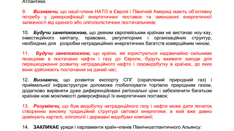 У резолютивній частині уряди і парламенти держав-членів НАТО закликають до об'єднання зусиль для підвищення енергетичної безпеки шляхом диверсифікації джерел енергопостачань, але не обмежуючись тільки розробкою нетрадиційних ресурсів.