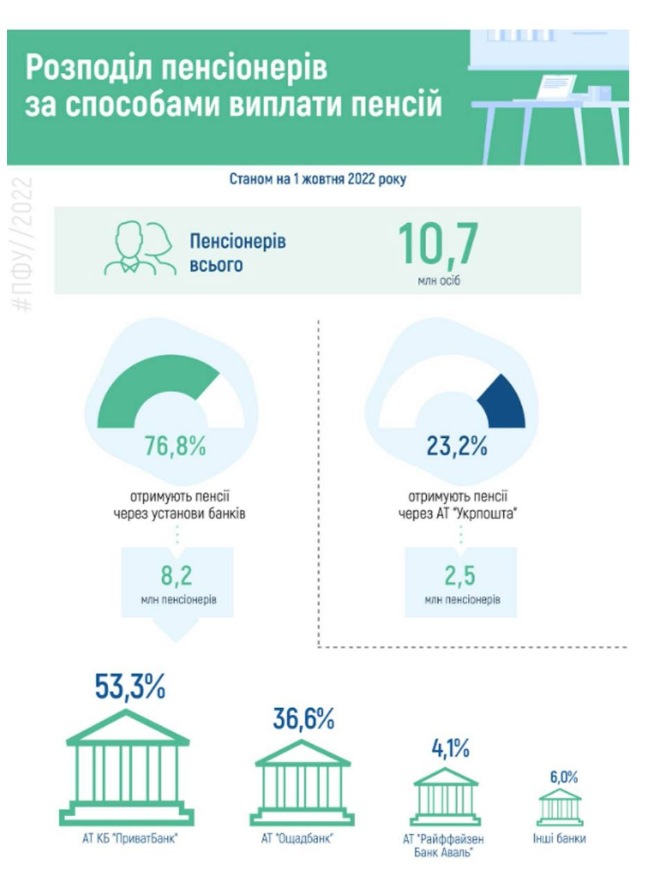 Станом на початок жовтня в Україні було зафіксовано 10,7 млн. пенсіонерів. Більшість із них одержують виплати через банки — 8,2 млн, або 76,8%. Доставкою грошей за допомогою «Укрпошти» користуються 2,5 млн. осіб, або 23,2%. Про це свідчать дані Пенсійного фонду.