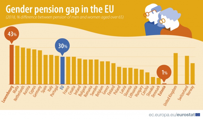 Хоча жінки отримували менші пенсії у всіх державах-членах ЄС, ступінь розриву сильно розрізняється. Найбільша різниця спостерігалася в Люксембурзі, де жінки старше 65 років отримували пенсію на 43% менше, ніж чоловіки. За Люксембургом йдуть Мальта (42%), Нідерланди (40%), Австрія (39%), Кіпр (38%) і Німеччина (37%).