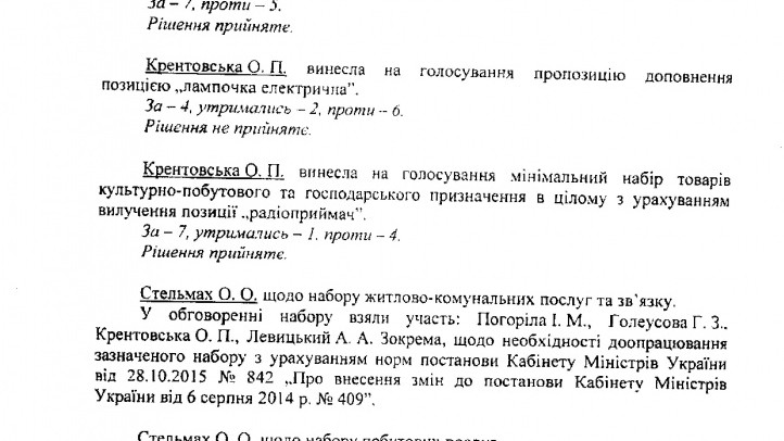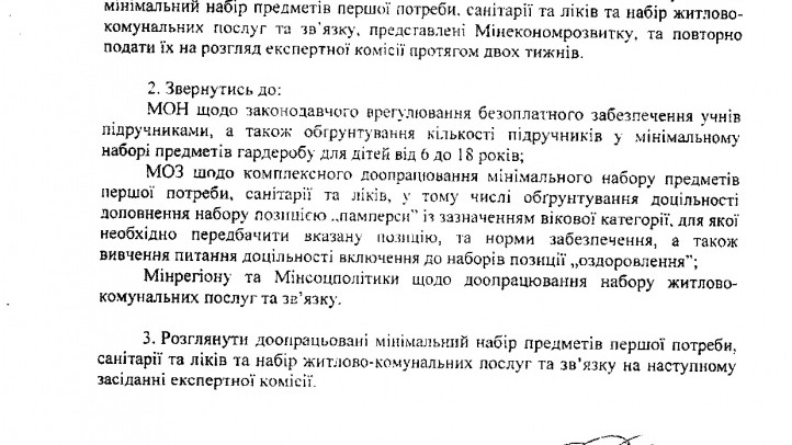 Виходячи з протоколу засідання, комісія не погодилася з тим, щоб врахувати в споживчому кошику позиції "рушник махровий" (2 шт. на одну особу), "памперси", "мобільний телефон" (один на 5 років). З приводу необхідності врахування позиції "памперси", - вирішили звернутися до МОЗ для з'ясування доцільності.