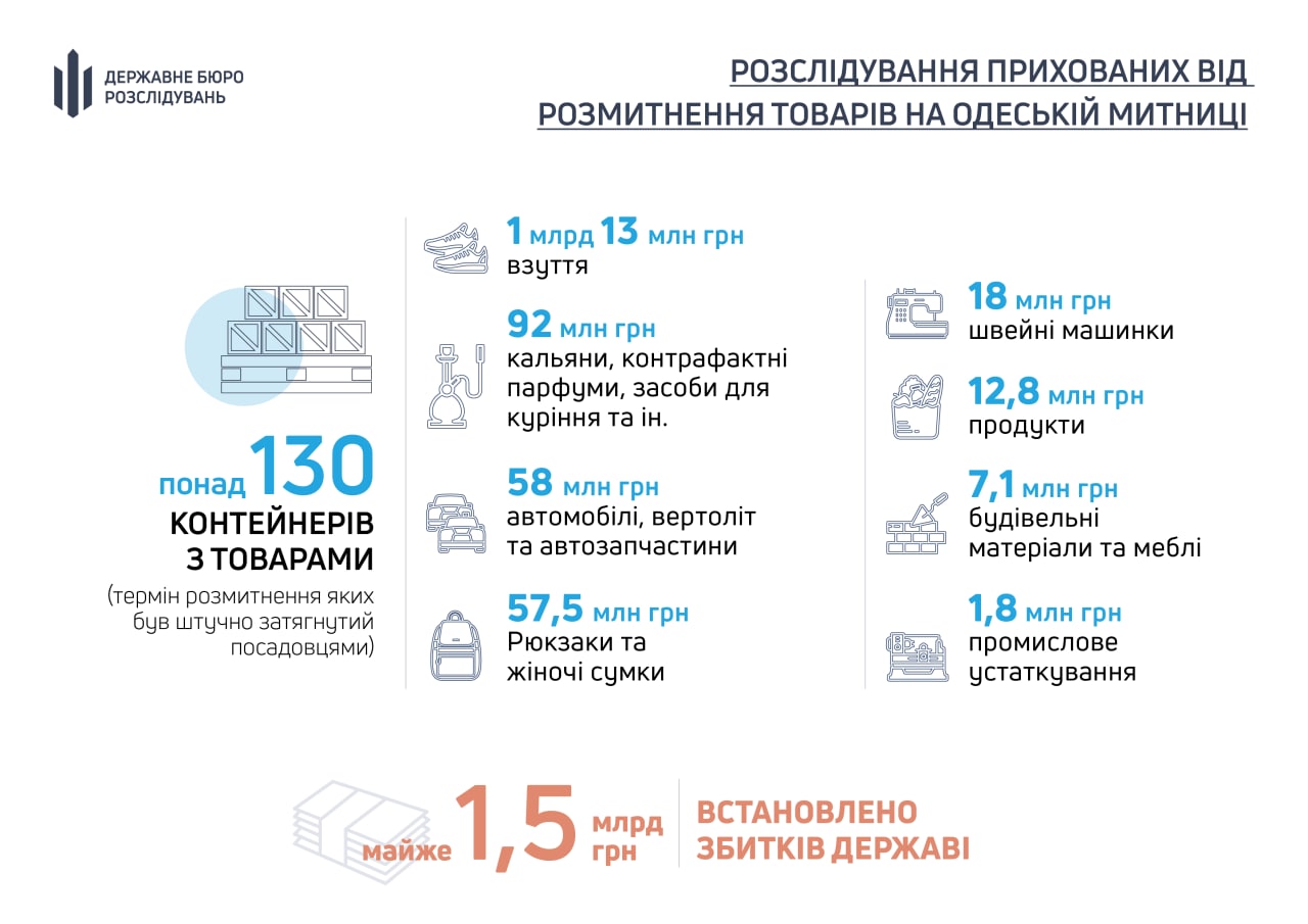 Державне бюро розслідувань завершило облік прихованих від розмитнення товарів на Одеській митниці. Мова йде про 133 контейнери, які виявили слідчі у жовтні, у яких виявили товари на понад 1,5 млрд гривень.