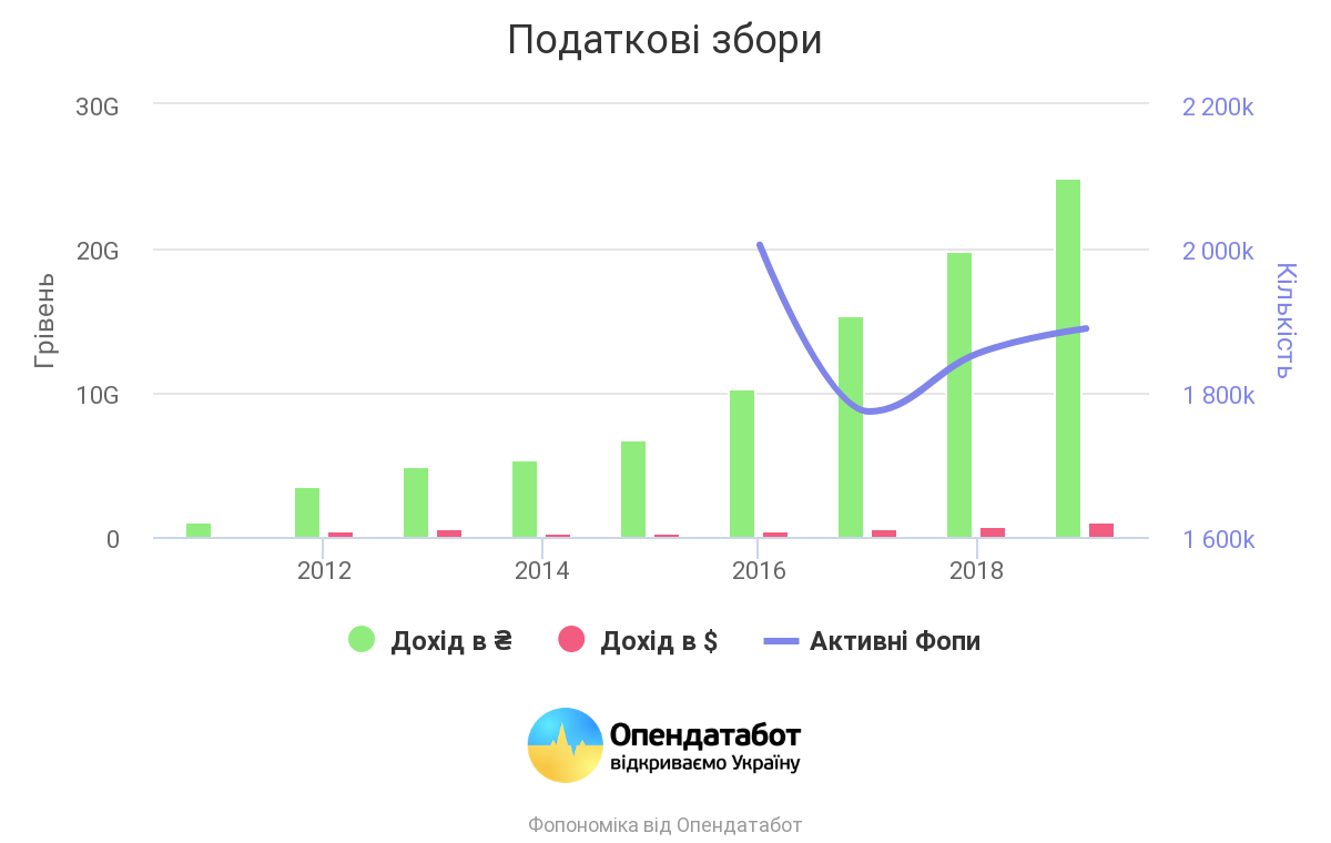 «За вісім років надходження від ФОП в бюджет зросли в 24 рази. Тільки за останні два роки сума надходжень зросла на 10 млрд гривень. У 2019 підприємці сплатили майже 25 млрд грн, в 2018 році ця сума становила 19,8 млрд грн, в 2017 - 15,4 млрд ", - йдеться в повідомленні.
