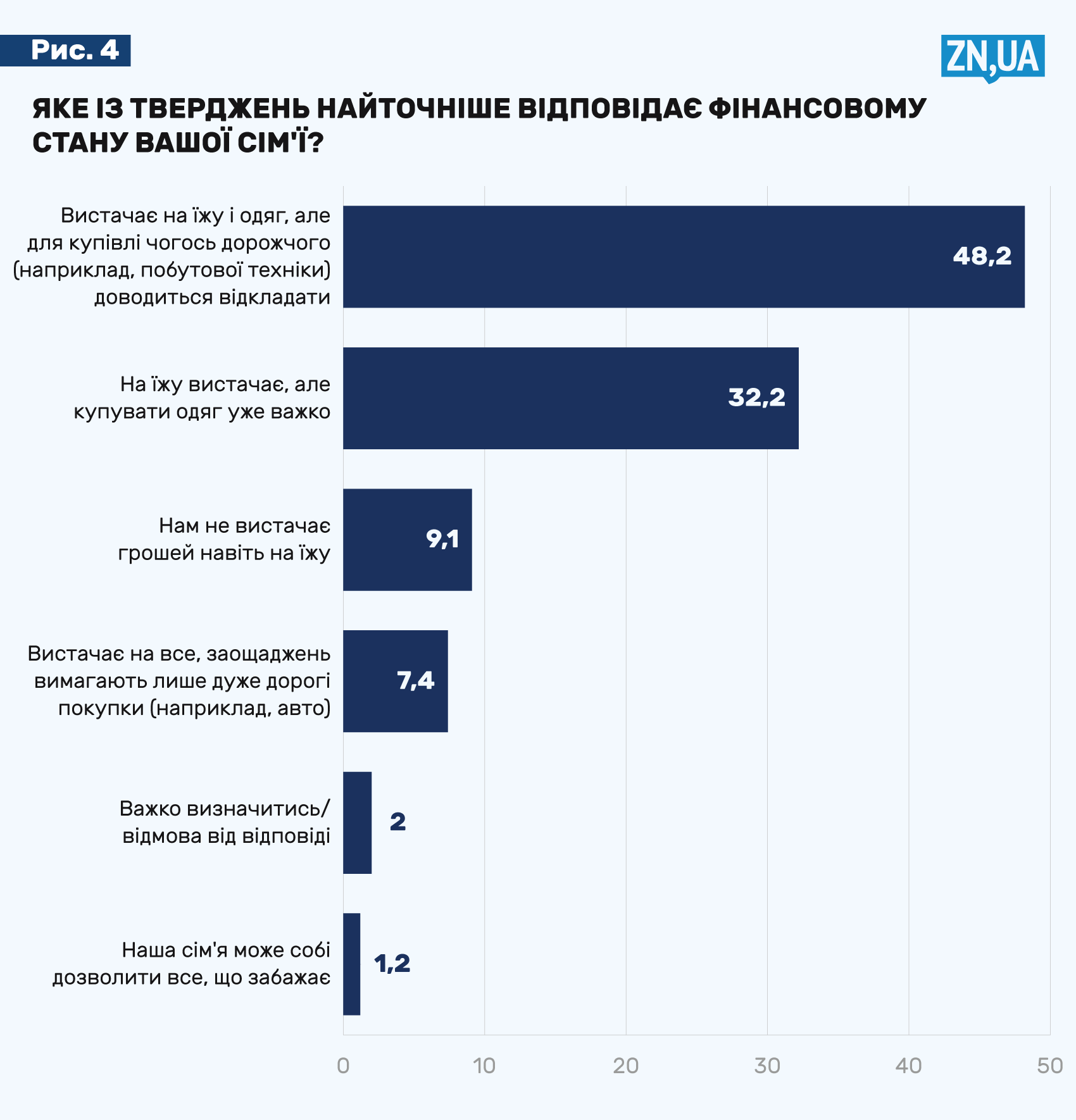 Так, на питання «Яке із тверджень найточніше відповідає фінансовому стану вашої сім'ї?» більш як 48% обрали варіант «Вистачає на їжу і одяг, але для купівлі чогось дорожчого (наприклад, побутової техніки) доводиться відкладати».