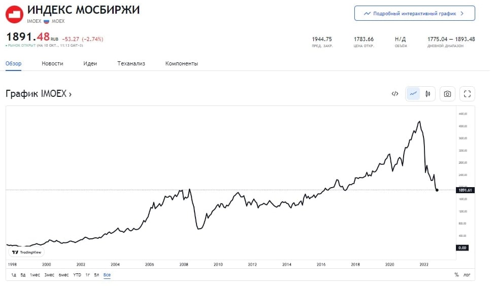 10 жовтня, після масовианих бомбардувань України з боку терористичних військ Російської Федерації, індекс Мосбіржі впав нижче за максимум у травні 2008 року. Про це зранку свідчили дані сайту біржі.